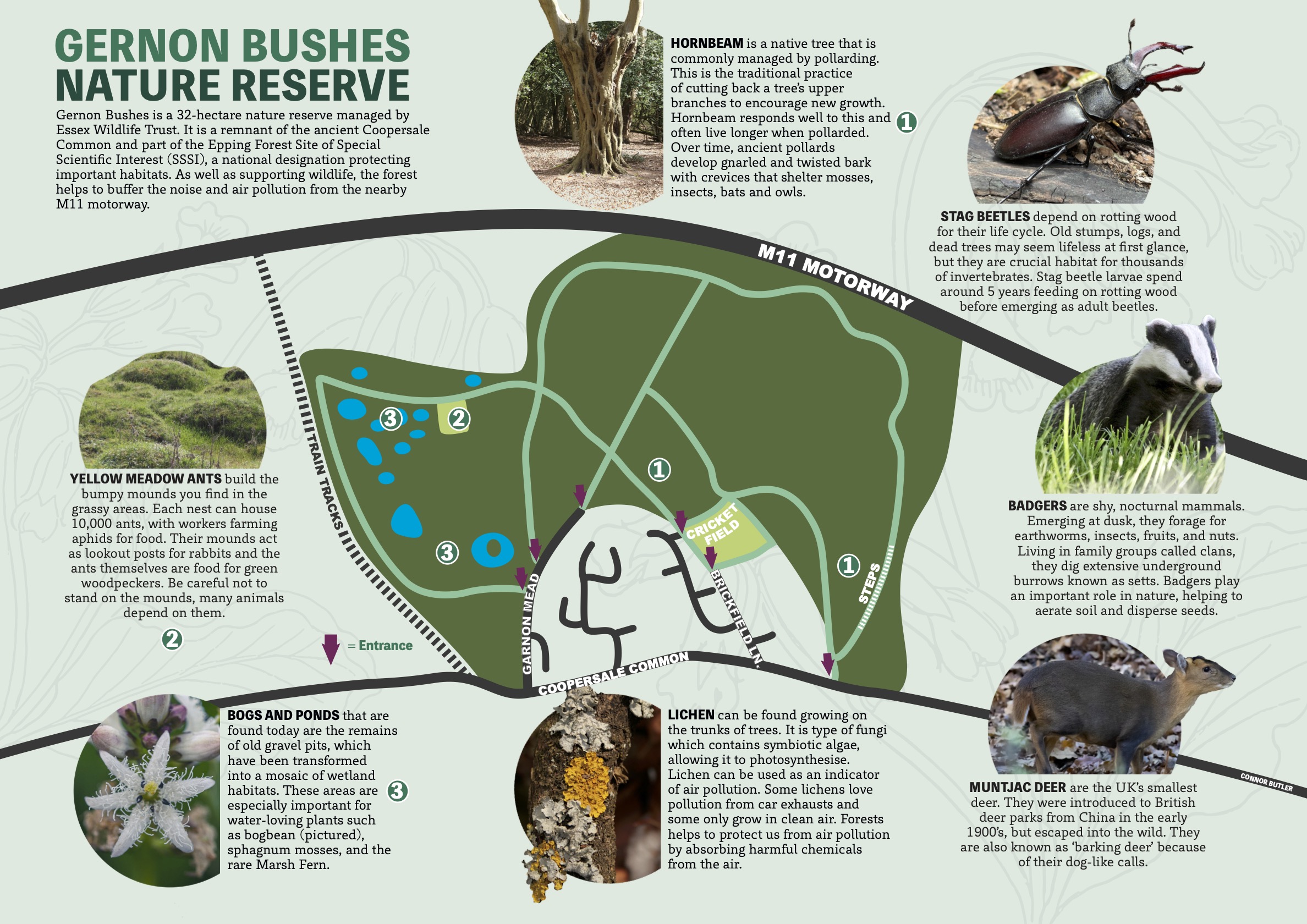 Connor was commissioned by Coopersale Community Group in Essex to design a map for adults and families which explained the importance of their local nature reserve, Gernon Bushes. After speaking with the community about the plants and animals that were important to them, Connor produced a map, which was printed out and given to all school children in the village. On the back of the map was a series of activities for children to undertake whilst in the nature reserve.
